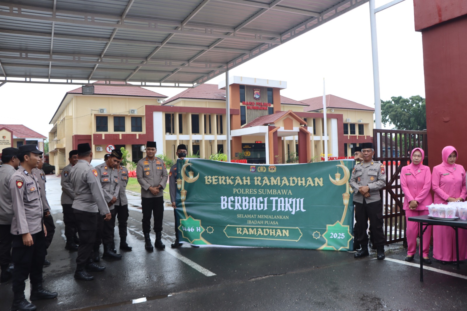 Sumbawa Besar–NTB, Dalam rangka menyambut bulan suci Ramadan, Kapolres Sumbawa, AKBP Bagus Nyoman Gede Junaedi SH, S.IK, M.AP., bersama dengan gabungan staf yang terdiri dari Bag Ren, SPKT, Humas, serta Bhayangkari, melaksanakan kegiatan sosial bagi-bagi takjil kepada masyarakat. Kegiatan ini dilaksanakan menjelang waktu berbuka puasa di depan Mapolres Sumbawa pada Senin, 17 Maret 2025.
