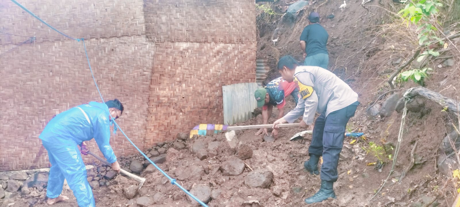 Sumbawa Barat – Bhabinkamtibmas Desa Mantun, Bripka Ramli, bersama Pemerintah Desa Mantun, Babinsa, PDPGR, perangkat dusun dan ketua RT, serta masyarakat sekitar melaksanakan gotong royong membantu warga yang terdampak tanah longsor di Dusun Mantun Barat, Desa Mantun, Kecamatan Maluk, Rabu (10/9/2025) .