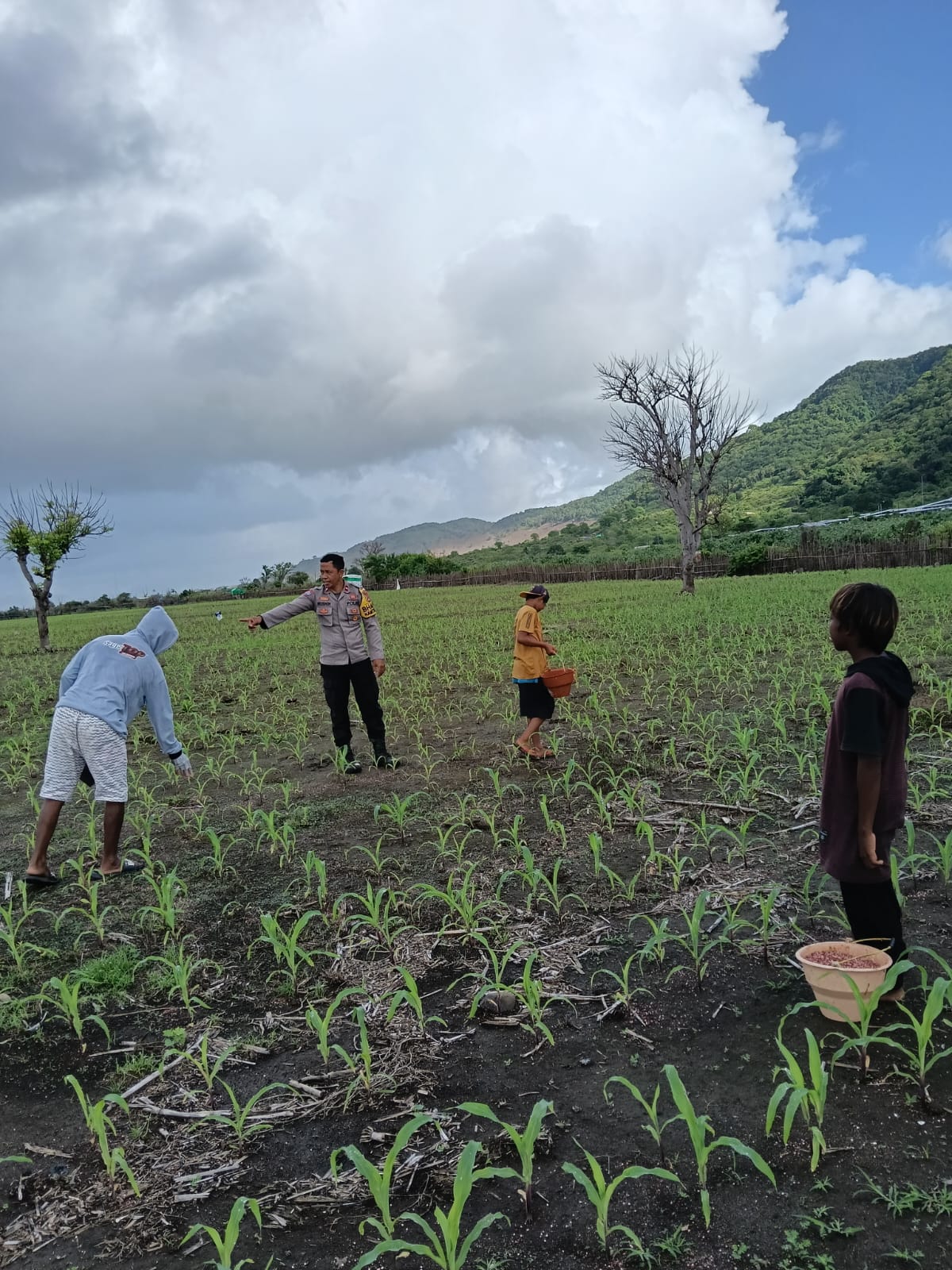 Dalam mendukung Program Ketahanan Pangan Nasional menuju Indonesia Emas 2045, Bhabinkamtibmas Desa Hu’u Polsek Hu’u Aipda M. Husnin melaksanakan kegiatan pendampingan dan pemantauan lahan pertanian milik warga di Dusun Nangadoro, Desa Hu’u, Kecamatan Hu’u, pada Senin (8/12/2025) pukul 09.10 Wita.