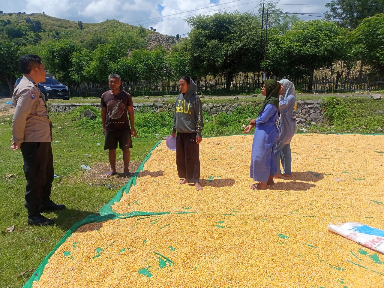 Dalam upaya mendukung Program Ketahanan Pangan Nasional menuju Indonesia Emas 2045, Bhabinkamtibmas Desa Marada, Polsek Hu’u, AIPDA Julkifli melaksanakan pemantauan terhadap aktivitas pengeringan jagung milik warga binaannya, Selasa (08/04/2025).