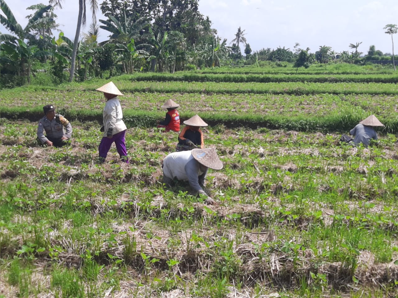 Aiptu Muhammad Bakri menyambangi para petani yang sedang membersihkan rumput liar pada tanaman kedelai mereka. Dalam pertemuan tersebut, ia tidak hanya berdialog tentang situasi keamanan dan ketertiban masyarakat (kamtibmas), tetapi juga secara aktif mendorong partisipasi warga untuk menyukseskan program swasembada pangan nasional.