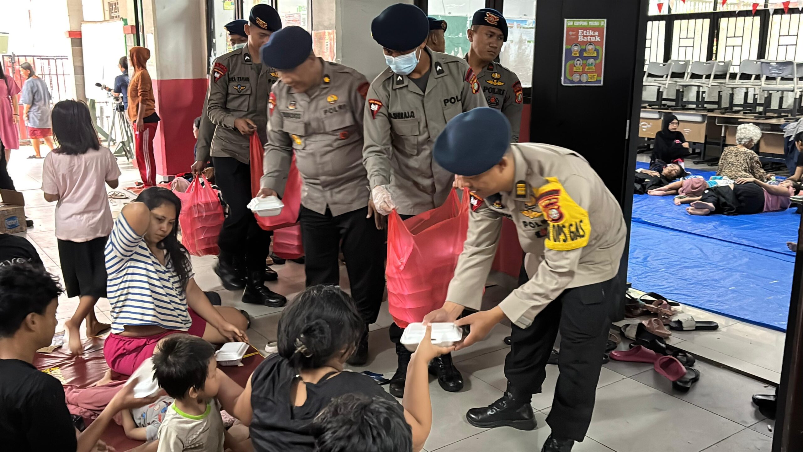 Sekitar pukul 06.30 WIB, tim dapur lapangan mulai membagikan sarapan berupa nasi goreng spesial kepada warga yang mengungsi di SDN Kampung Melayu 01. Hingga pukul 07.30 WIB, sebanyak 300 bungkus makanan telah dibagikan.