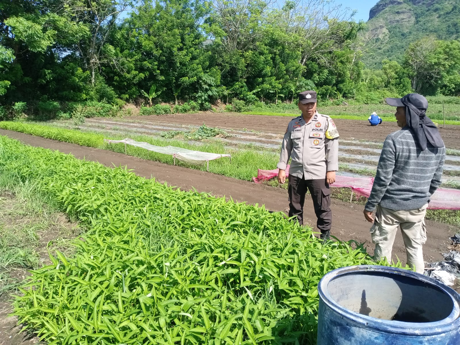 Bhabinkamtibmas melakukan pengecekan kondisi tanaman sekaligus memberikan arahan mengenai pemeliharaan yang efektif dan memberikan motivasi kepada warga agar terus memanfaatkan pekarangan sebagai sumber pangan keluarga.