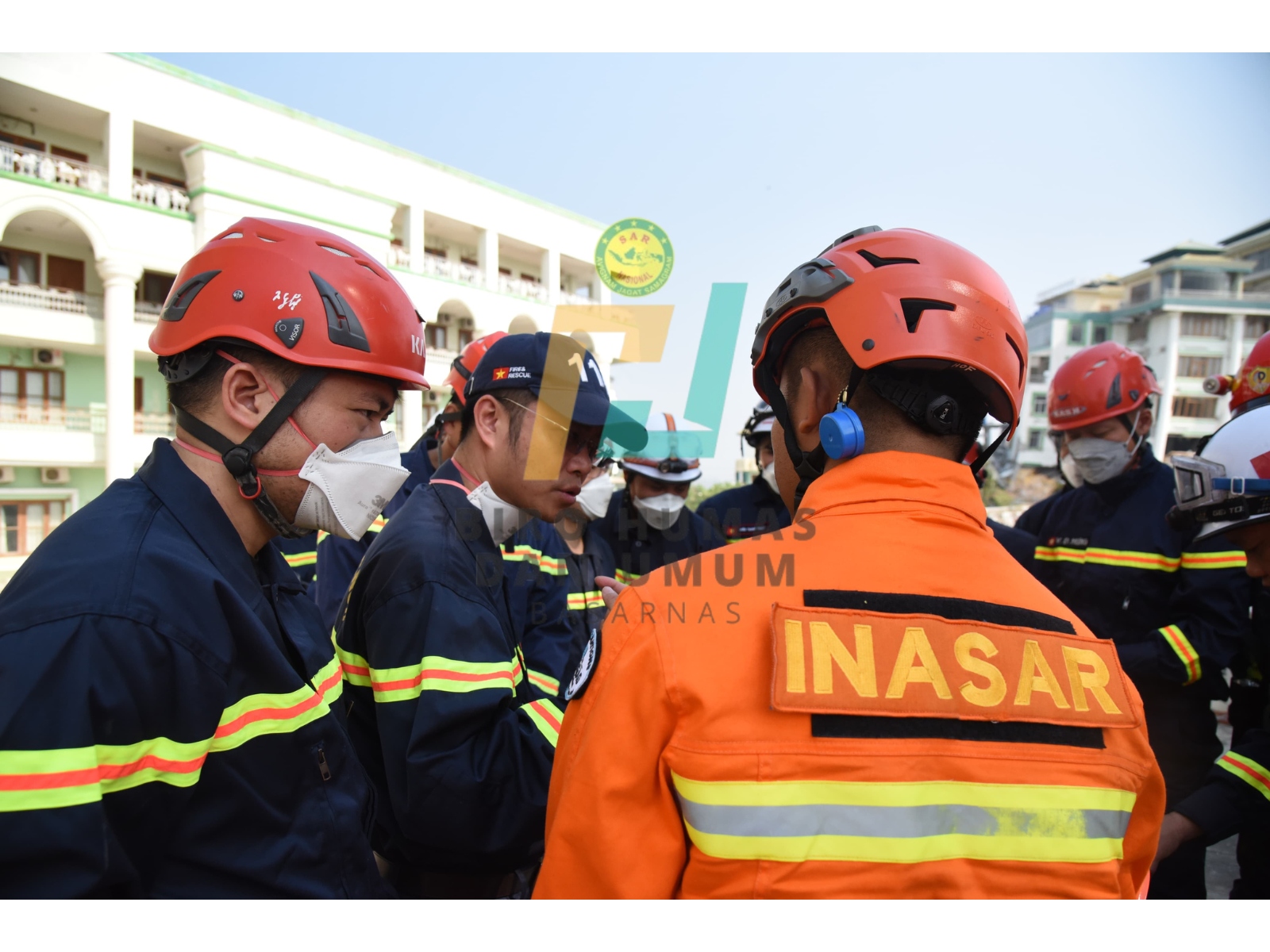 Naypyidaw – Myanmar : – Memasuki hari keempat, tim INASAR masih melakukan pencarian terhadap korban gempa Myanmar di area Jade Hotel, Naypyitaw, Myanmar dengan menurunkan tim Alfa dan Charlie beserta K9 dan medis, Jumat (4/4).