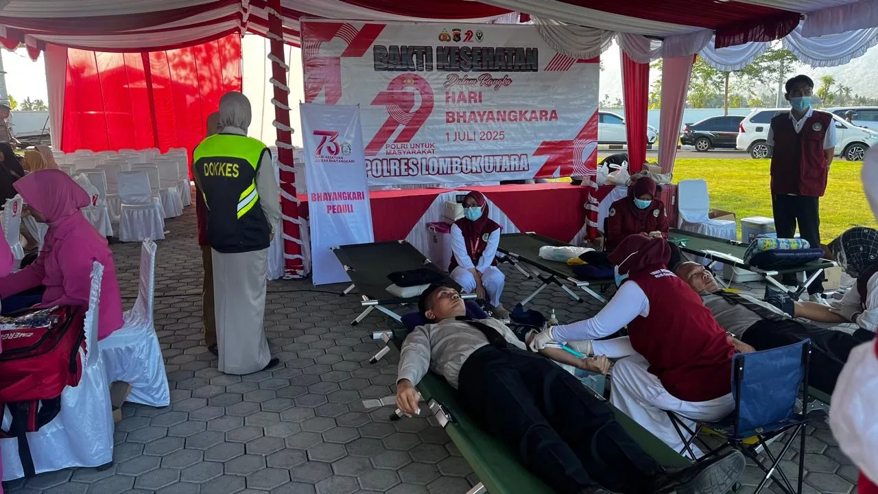 Lombok Utara – Dalam rangka menyambut Hari Ulang Tahun (HUT) Bhayangkara ke-79 Tahun 2025, Polres Lombok Utara bersama RSUD Lombok Utara menggelar kegiatan donor darah di aula Bupati , Kegiatan ini menjadi wujud nyata kepedulian Polri terhadap kebutuhan kemanusiaan, sekaligus mempererat sinergitas dua institusi negara dalam melayani masyarakat. (1/7/2025).