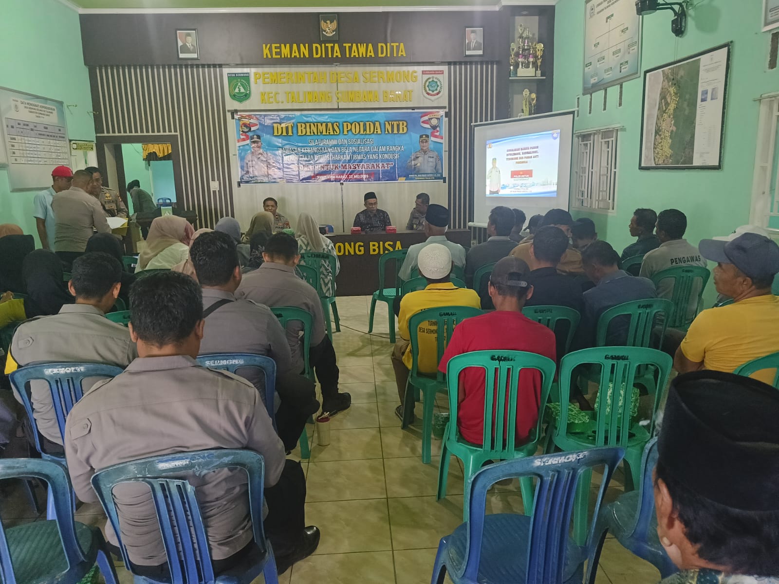 Acara ini dihadiri oleh Kasubdit Bintibsos Ditbinmas Polda NTB Kompol Dewa Made Sucipta, S.Sos., bersama tim, Kasat Binmas Polres Sumbawa Barat AKP Susanto beserta anggota, narasumber dari Kementerian Agama Kabupaten Sumbawa Barat, Kepala Desa Sermong Rosyidi, S.Sos., Bhabinkamtibmas, Babinsa, Ketua Kelompok Masyarakat (Pokmas), serta warga masyarakat lainnya.