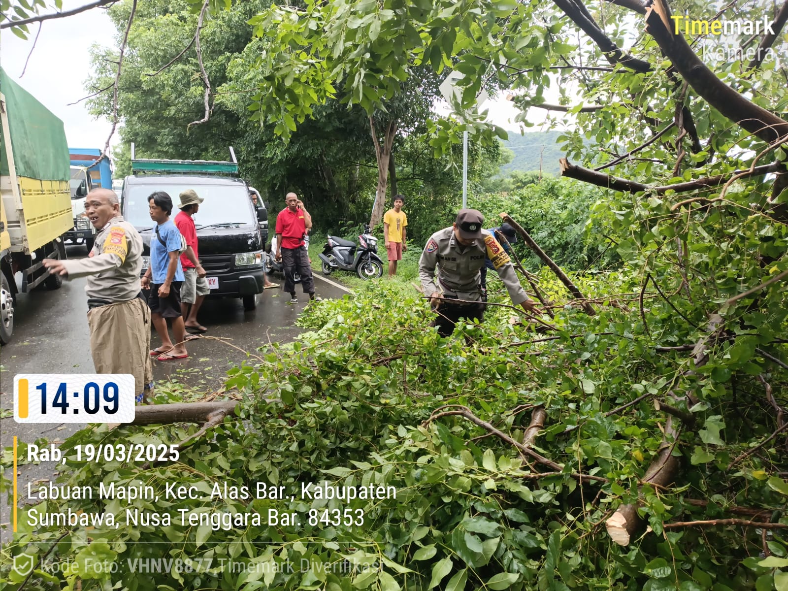 Polsek Alas Barat Bersama Masyarakat Evakuasi Pohon Tumbang yang Menutupi Jalan