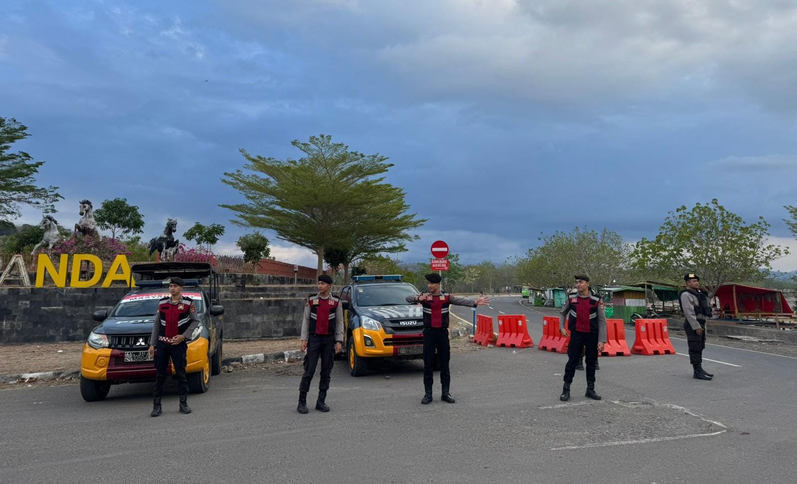 Saat warga/ masyarakat pengguna jalan masih melakukan aktivitas di sore hari Polres Bima Polda NTB menempatkan personel Satsamapta guna melaksanakan pengaturan lalu lintas di Simpang tiga patung kuda Desa Panda Kecamatan Palibelo Kabupaten Bima