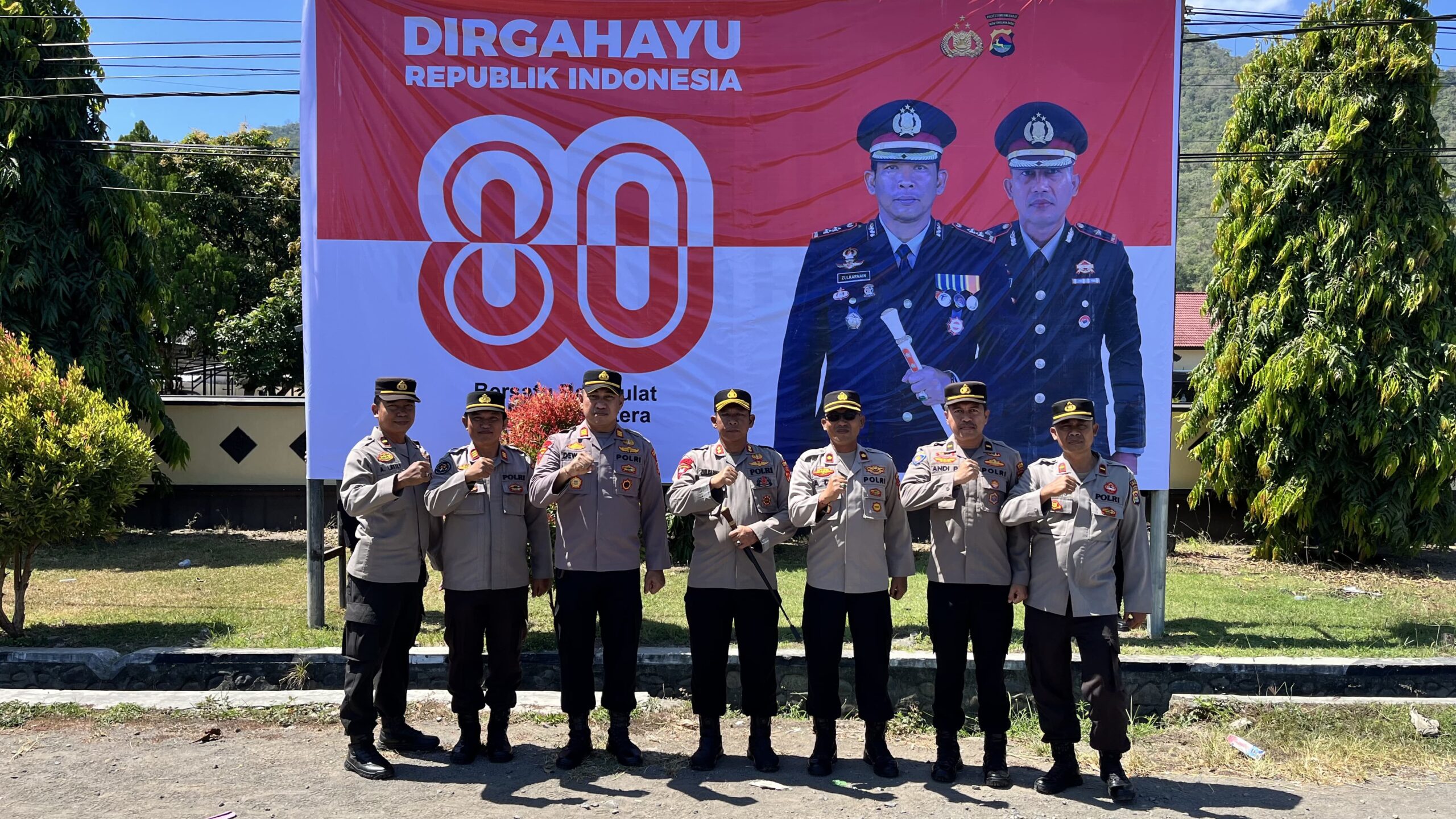 Sumbawa Barat — Meriahkan peringatan Hari Ulang Tahun ke-80 Republik Indonesia, Kapolres bersama PJU Polres Sumbawa Barat Melaksanakan Pemasangan spanduk ucapan Dirgahayu Republik Indonesia di jalan raya utama depan Mapolres. Selasa,(12/08/2025).