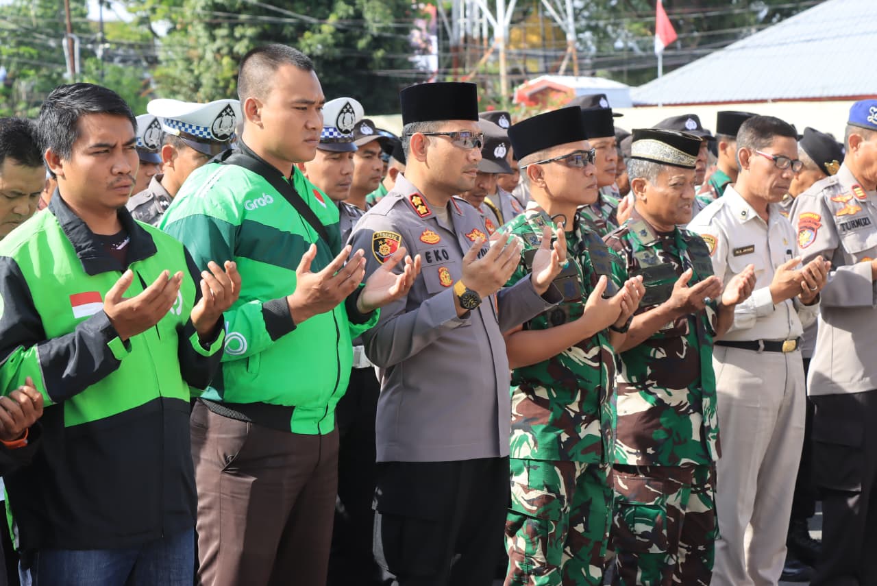 Lombok Tengah (NTB) – Sebagai wujud sinergi dan komitmen menjaga keamanan, Polres Lombok Tengah bersama Kodim 1620/Lombok Tengah dan komunitas Ojek Online (Ojol) menggelar kegiatan doa bersama untuk kedamaian negeri di Lapangan Apel Mapolres, Sabtu (30/8).