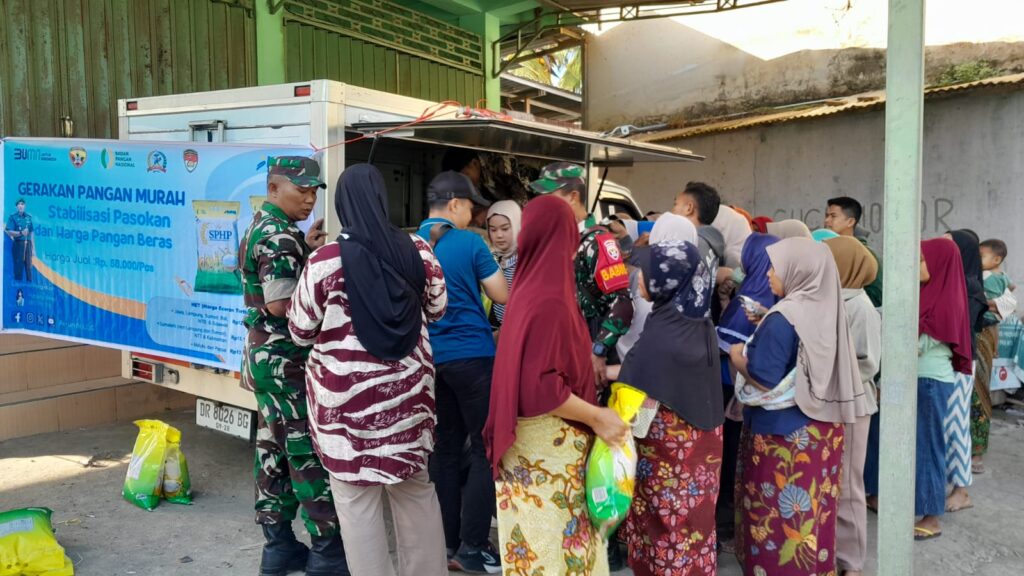 Lombok Barat, NTB – Dalam upaya menekan lonjakan harga kebutuhan pokok dan menjaga stabilitas pasokan pangan, Komando Distrik Militer (Kodim) 1606/Mataram bekerja sama dengan Perum Bulog Kantor Wilayah Nusa Tenggara Barat (NTB) menggelar Gerakan Pangan Murah (GPM) di Pasar Umum Desa Langko, Kecamatan Lingsar, Lombok Barat, Jum’at (15/8/2025).